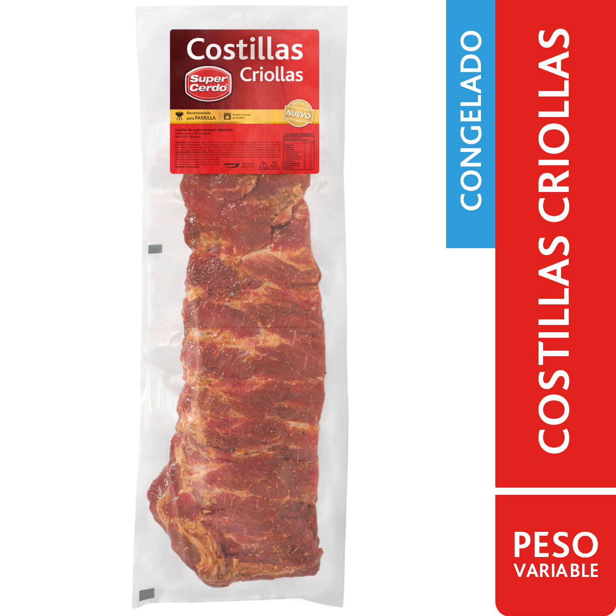 - Descripción: Costillas criollas de peso variable. El peso de la caja puede variar entre 8 a 15 kg. aprox. Producto es marinado hasta un 15%, saborizado y envasado individualmente en bolsa vacío.